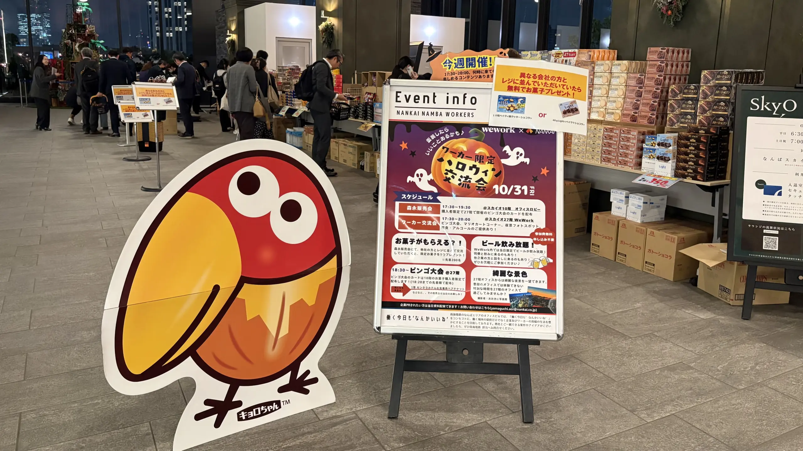 10月31日、WeWork なんばスカイオ のコミュニティチームは、入居するなんばスカイオのビルオーナーである南海電気鉄道株式会社(南海電鉄)とともに、「なんばスカイオ ハロウィン交流会」を開催しました。なんばスカイオ内 WeWork 入居メンバーのうち4社の協賛、10社のブース出展のご協力をいただき、近隣ビルのパークスタワーのワーカー含む158名が来場する交流会となりました。