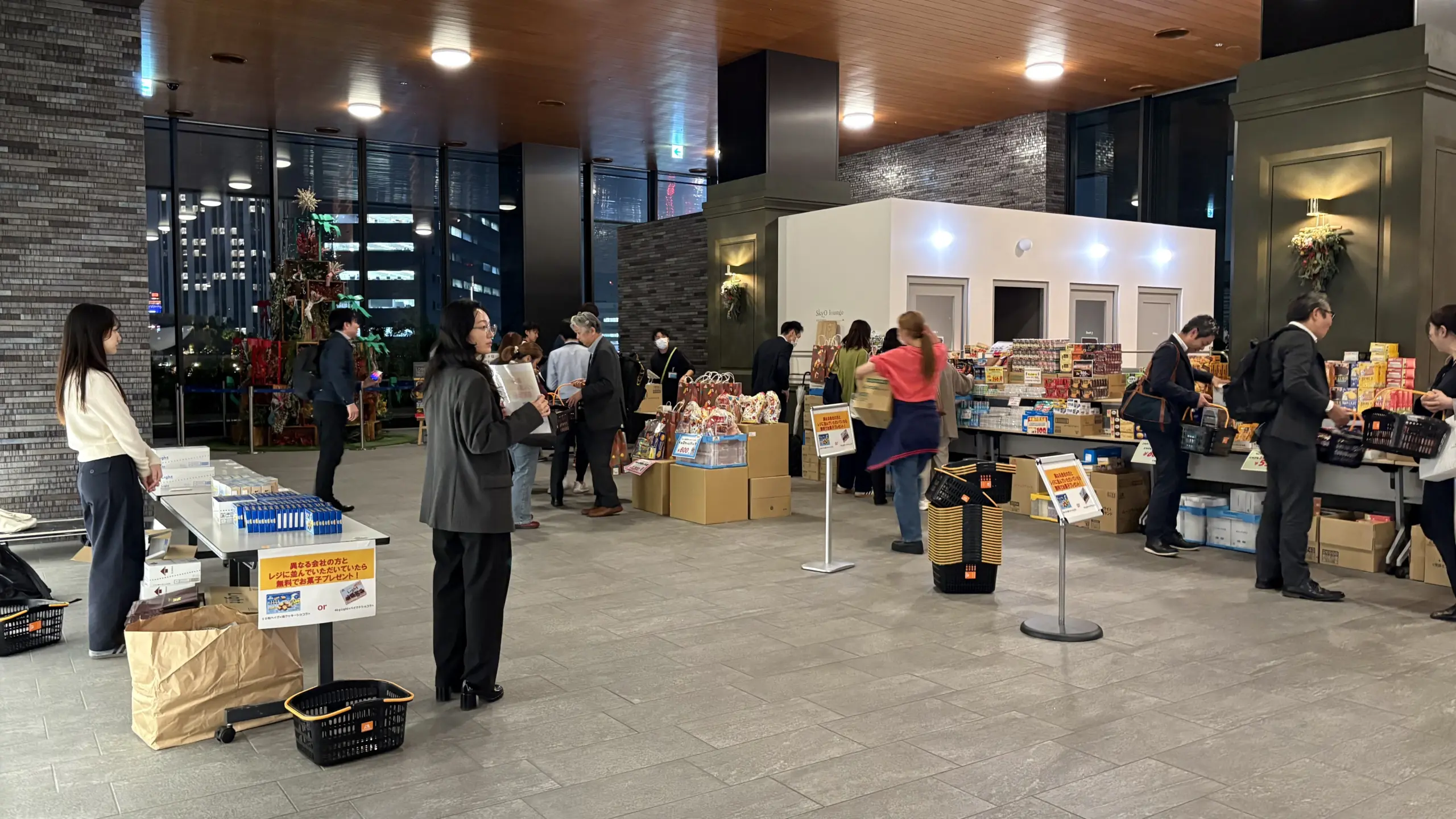 10階 なんばスカイオ オフィスロビーでは、 森永市場開発株式会社 によるお菓子の出張販売会を開催。他社の方とレジの列に並ぶとスペシャルなお菓子をプレゼントしたり、購入者にはビンゴカードを配布しました。 そのビンゴカードを持って27階にある WeWork に来場してもらう流れを作り、WeWork では、ビンゴ大会、ゲーム大会、フォトブース、 WeWork ツアーを実施しました。