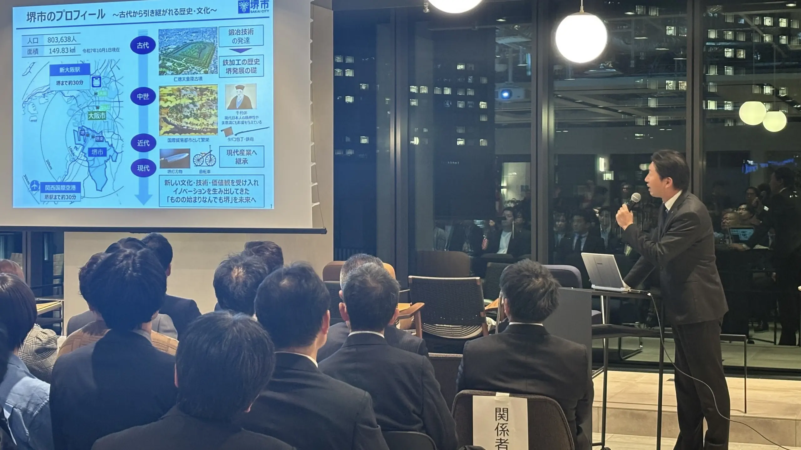 本日は、堺市の歴史や未来を感じていただければと思います。まず堺市のプロフィールです。人口803,000人、全国にある1,700以上ある自治体の中で約15番目の規模です。場所は大阪市のすぐ南にございます。特筆すべきは、歴史だと思っておりまして、日本国内を見ても独自の歴史を築き上げてきたのが堺市です。まず古代の時代には世界遺産である、百舌鳥・古市古墳群が築造され、中世の時代には『国際貿易としての黄金の日々』と称されるほど繁栄を極めました。海外との交流を通じて新しい技術や文化的価値観を取り入れてイノベーションを次々と生み出しながら日本中に広げたことから、『もののはじまりなんでも堺』と称されました。鉄砲、包丁そして現在の自転車産業や伝統産業も脈々と続いております。そして中世の時代に活躍した千利休は堺の生まれでございまして、利休が大成した茶の湯の文化は現代の日本人の精神にも大きくかかわっております。これらを決して昔話とすることなく、『もののはじまりなんでも堺』を世界にも繋げていきたいという想いで行政を行っております。