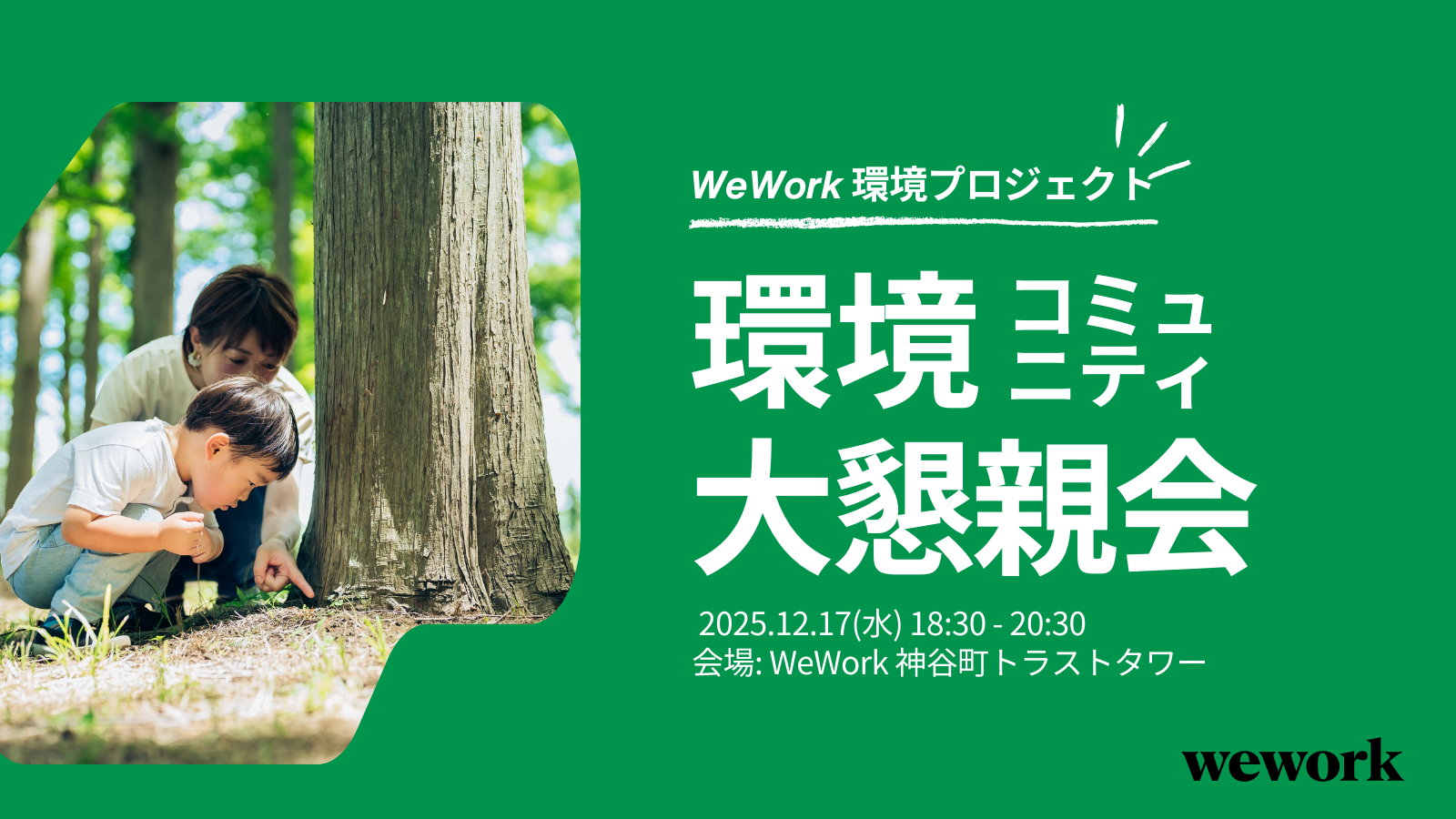 2025年、WeWorkでは「環境プロジェクト」が発足し、メンバーの皆様と共に数々の活動を行ってまいりました。 この一年、素晴らしい取り組みが生まれたのは、ひとえに皆様の熱意とご協力のおかげです。 つきましては、プロジェクトの締めくくりとして、そして皆様への感謝を込めて「大懇親会」を開催いたします。 会場は、東京タワーを一望できる、WeWork神谷町トラストタワー内の特別ラウンジ「SpeakEasy」。 普段とは少し違う特別な空間で、活動を振り返りながら親睦を深めませんか? 環境コミュニティに関わってくださった方はもちろん、これから環境改善に取り組みたいという方も大歓迎です。 2025年の締めくくりに、皆様と乾杯できることを楽しみにしています! ■ ご参加対象者 ・環境コミュニティに関わってくださった皆様 ・環境・サステナビリティに関心のある方 ■ イベントスケジュール 18:00 開場 18:30 大懇談会 開会 19:00 交流会 20:30 閉会 ■ 場所:WeWork 神谷町トラストタワー 23F SpeakEasy ■ 使用言語:日本語 ■ 主催:WWJ 株式会社(WeWork 環境プロジェクトチーム)