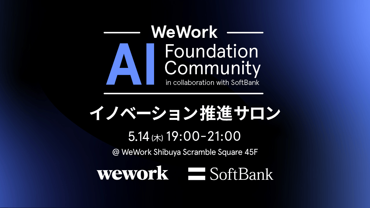 ■概要 2026年4月に始動した「AI Foundation Community」。 5月は、AIスタートアップの皆様、およびAI領域での共創や協業を目指す大企業様向けに「イノベーション推進サロン」を開催いたします。 本イベントでは、WeWork Japanのコミュニティ基盤に、ソフトバンクのスタートアップ企業向けのプログラム「AI Foundation for Startups(AIFS)」による支援を掛け合わせたAI Foundation Communityの「詳細な支援内容」「審査プロセス」「今後のスケジュール」などの最新情報をお届けします。 当日は、AI業界を牽引するスピーカーを招いたスペシャルトークに加え、WeWork Japanおよびソフトバンクの担当者に直接相談できる専用ブースも設置いたします。 6月に開催される「イノベーターピッチコンペティション」へのエントリーに向けた、絶好のネットワーキング・情報収集の機会としてぜひご参加ください。 ■AI共創エコシステムを支える3つの基盤 ・AI Infrastructure - AI計算基盤・ソブリンクラウド ・Enterprise Collaboration - 大企業・自治体との共創機会 ・Community Network - WeWorkの企業コミュニティ ■こんな方におすすめ AIスタートアップ ・自社AIソリューションを大企業や自治体へ展開したい ・高性能・高信頼なAI開発環境やソブリン性を備えたクラウドサービスを活用したい ・事業拡大に向けたパートナーや顧客を開拓したい 大企業・自治体 ・信頼できるAIスタートアップと共創したい ・業務課題や新規事業にAIを活用したい ・オープンイノベーションの機会を探している ■このイベントで得られること ・AI Foundation Community の全体像、特に支援体制に関する具体的な情報と最新実績 ・AI業界の最前線で活躍する企業のインサイト ・6月ピッチコンペ登壇に向けた、担当者との直接面談 (※事前の事業情報提出などは不要でお気軽に相談可能です) ・AIスタートアップや大企業とのネットワーキング機会 ■イベントプログラム ※プログラムの内容は変更となる可能性があります 18:30 受付開始 19:00 オープニング 19:10 AI Foundation Community について:プロジェクト詳細と最新情報の公開 19:30 【特別ゲストトーク】Coming Soon 20:00 ネットワーキング:「AIFSブース」「ピッチ登壇相談ブース」をオープン 21:00 クロージング ■登壇者(予定)※確定次第、随時アップデートいたします。 Coming Soon! ■ 使用言語: 日本語 ■ 場所:WeWork 渋谷スクランブルスクエア 45F 共用ラウンジ ■ 主催:WeWork Japan(オープンイノベーションプロジェクトチーム) ■注意事項 ※定員に達し次第、受付を終了します ※本イベントの趣旨に適さないと判断した場合、参加をお断りすることがあります ※AIFSの提供にあたり事前に所定の審査があります ※イベントの様子は、WeWorkおよびソフトバンクの広報活動(SNS・オウンドメディア等)で使用される場合があります