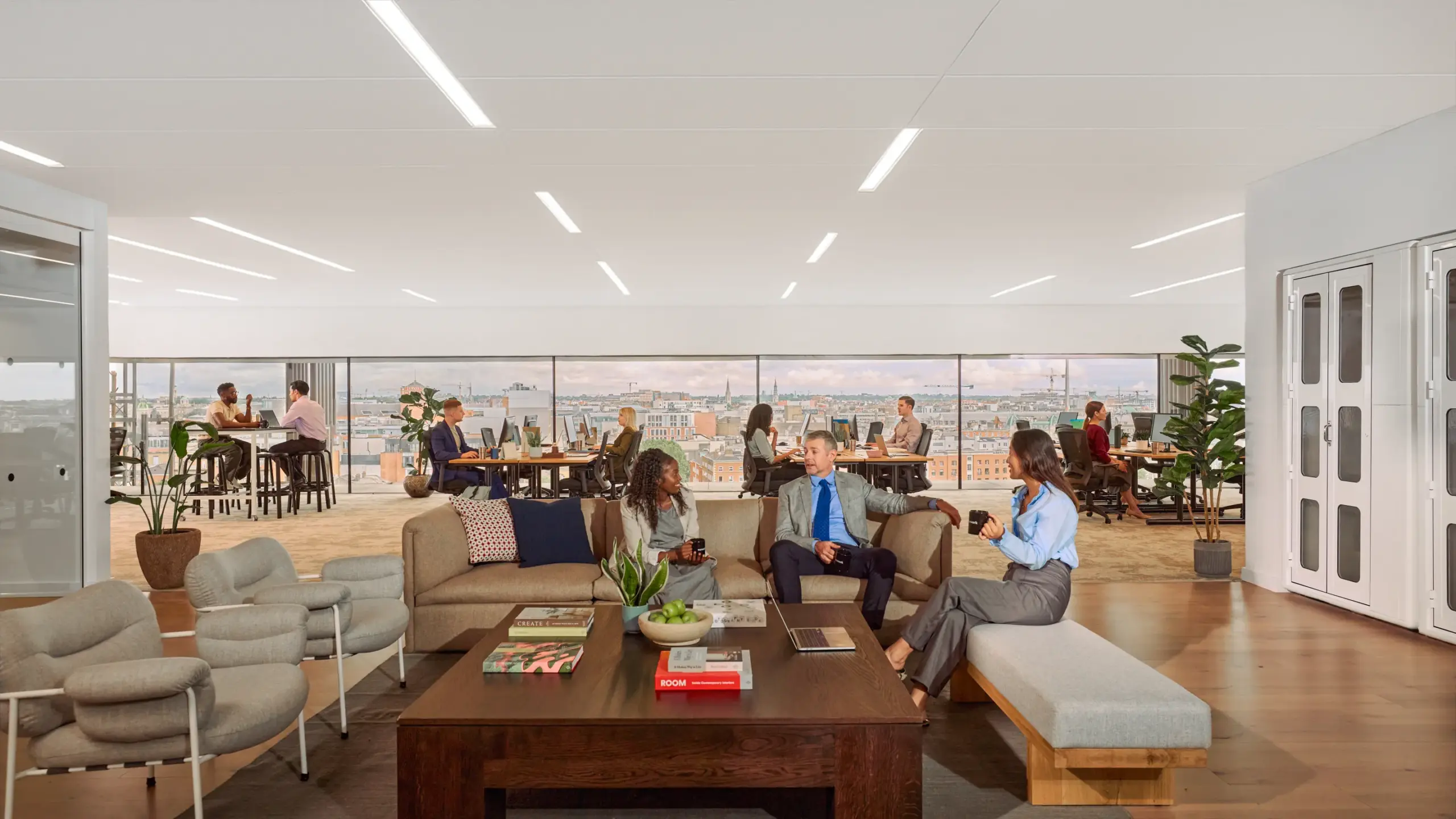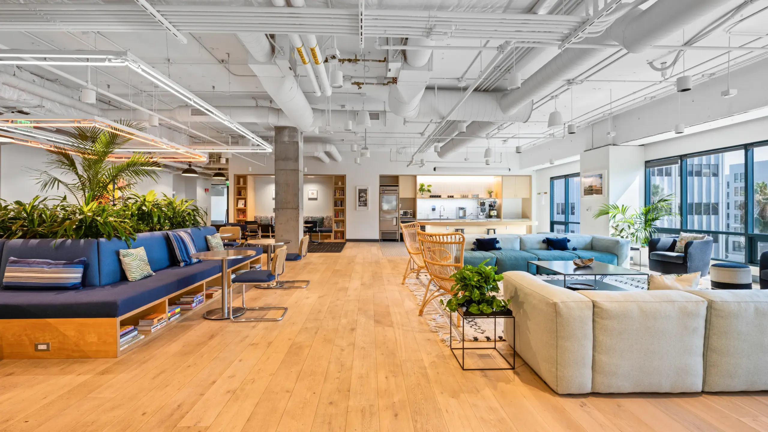 例えば、WeWork の空間は、従来のオフィスのように、机がずらりと並び室内を強い蛍光灯が照らすことはありませんが、次のようなメリットがあります。